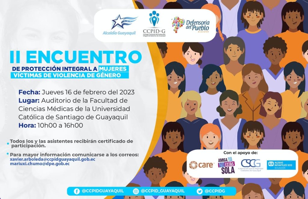 Con el objetivo de proporcionar a los funcionarios públicos herramientas y técnicas para identificar y atender de manera efectiva a las mujeres víctimas de violencia, el Consejo Cantonal de Protección Integral de Derechos de Guayaquil y la Defensoría del Pueblo en alianza con “Amiga, ya no estás sola”, y CARE Ecuador, realizarán el II ENCUENTRO DE PROTECCIÓN A MUJERES VÍCTIMAS DE VIOLENCIA DE GÉNERO, el próximo jueves 16 de febrero de 10h00 a 16h00 en el auditorio de la Facultad de Medicina de la Universidad Católica de Santiago de Guayaquil.